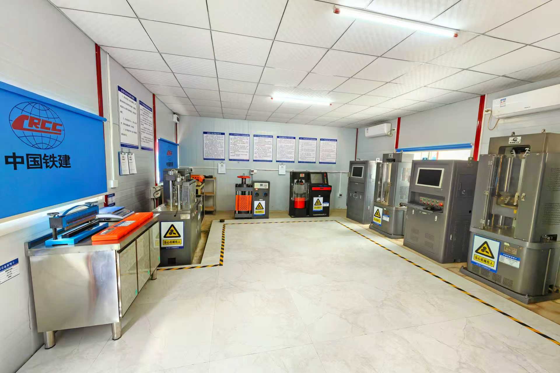 作為合湛高鐵廣西段1標的關鍵配套設施,中心試驗室總占地面積達3100平方米,采用阻燃型板房,涵蓋辦公區(qū)、試驗區(qū)、宿舍區(qū)等核心區(qū)域。試驗區(qū)細分計量室、土工室、力學室、標養(yǎng)室等14間功能室,可開展水泥、粉煤灰、鋼筋、混凝土耐久性能、路基檢測、橋梁檢測等22類157個參數(shù)的試驗檢測,完全覆蓋項目建設核心需求。